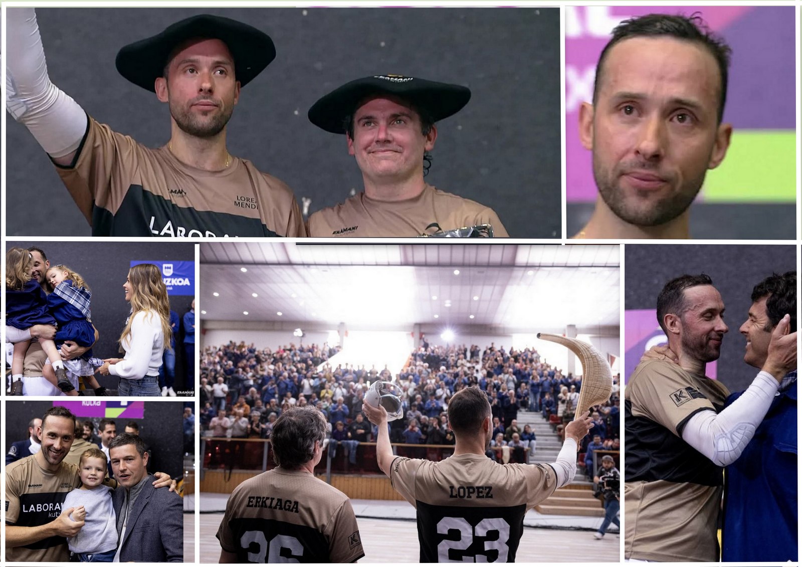 De g à dr et de bas en haut: sur le podium avec son vieux complice Aritz Erkiaga; Saisi par l'émotion. En famille avec ses deux filles et son épouse; Saluant le jaï alaï de Zumaïa venu rien que pour lui ; L'accolade avec une autre légende Goïkoxea qui fut à la fois son ami et son grand rival sur les canchas américaines. David Minvielle jeune retraité de la punta lui aussi était parmi ses invités.