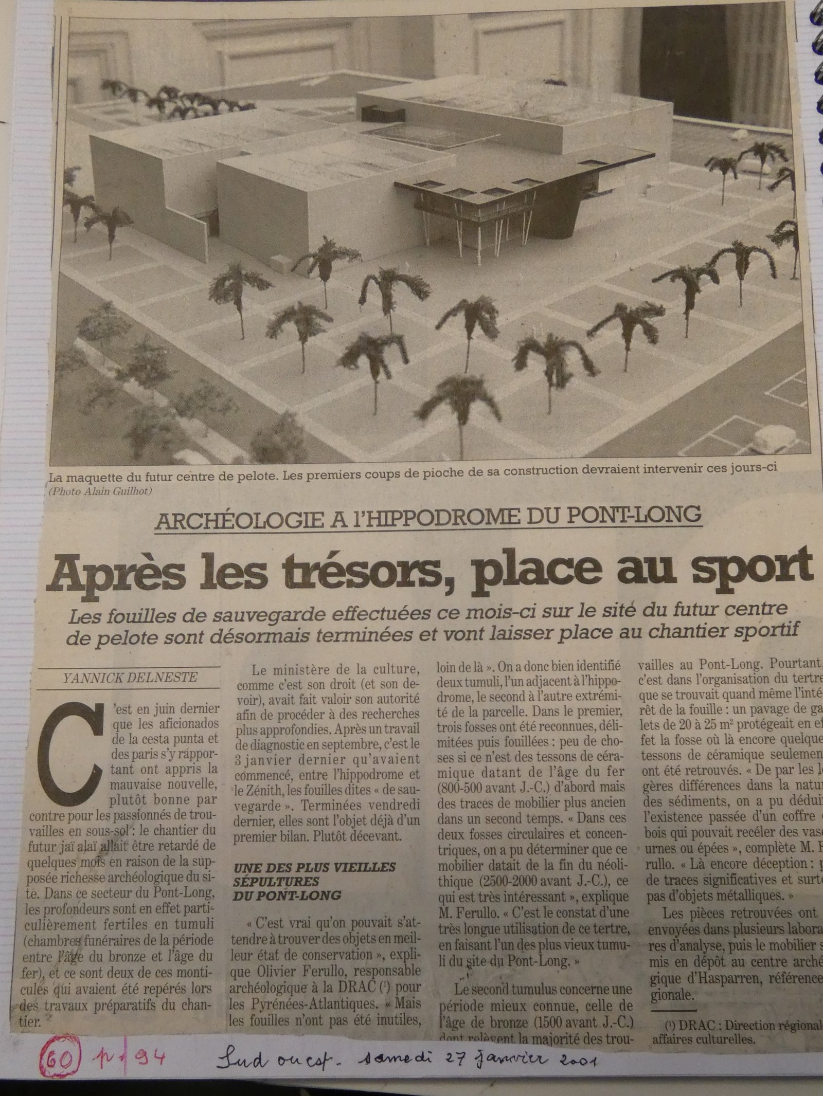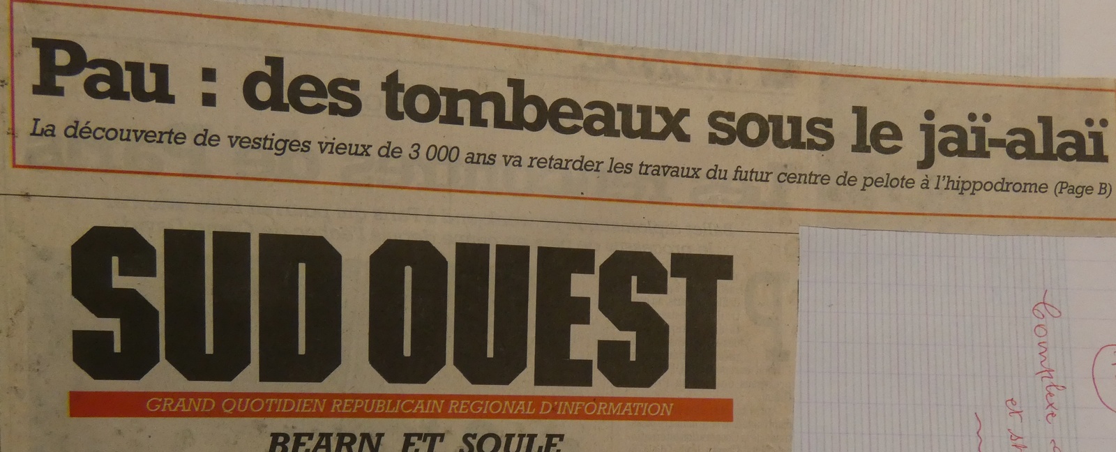 de g à dr : La reproduction des coupures de presse de Sud-Ouest et de Pyrénées-Presse relatant l’épisode archéologique des tumuli du Pont Long qui ajoutèrent encore du retard au chantier du complexe de pelote.