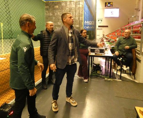 Heureux toujours les partenaires lorsque les joueurs viennent à leur rencontre pour la cérémonie traditionnelle de remise des maillots. C'est la direction d'Energeco qui a remis à Jean Olharan sa tenue, tandis que Sébastien Itoïz, vainqueur de l'édition 2019, avec Jean Olharan, la remettait à David Minvielle.Heureux de se retrouver Michel Billac et Christian Loustaudine dont on ne sait par contre pas s'ils évoquaient des souvenirs de canchas ou de terrains de rugby puisqu'ils furent tous deux internationaux avec France "B" et puis rivaux lors des Sections-St Jean de Luz, ou Billace jouait trois quart centre quand Christian Loustaudine évoluait en troisième ligne à la Section!